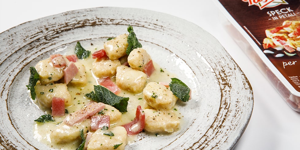Sciogliete una noce di burro in una padella con i gambi della salvia, tuffate i capunsei nell’acqua e scolateli direttamente in padella non appena verranno a galla. Togliete la salvia, aggiungete metà dei vostri Petali di Speck Negroni e saltate fuori dal fuoco, aggiungendo poca acqua per volta. Servite i capunsei con qualche foglia di salvia fritta croccante e decorate con i Petali di Speck Negroni.