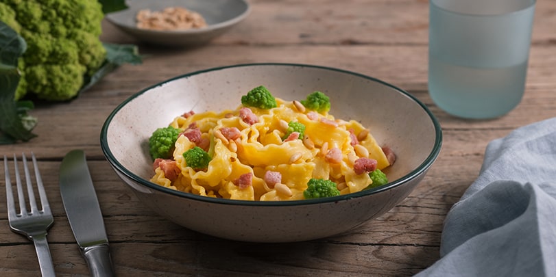 La classica ricetta della pasta alla carbonara arricchita con broccolo romano e pinoli.