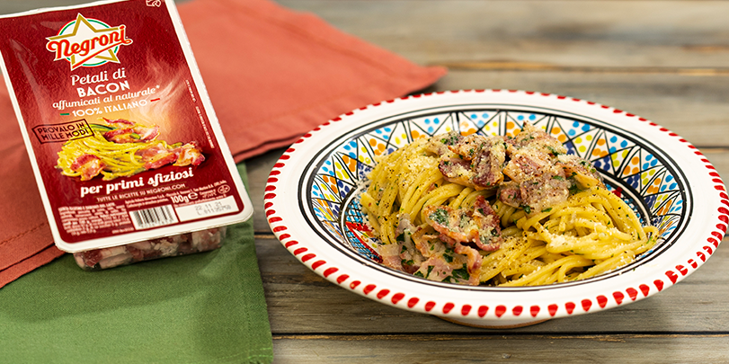 In una padella antiaderente fate rosolare i Petali di Bacon Negroni, tritate poi la cipolla e fatela stufare in una padella con un filo di olio extravergine di oliva a fiamma dolce. Cuocete gli spaghetti in abbondante acqua salata e nel frattempo tritate finemente le erbe fresche. Scolate gli spaghetti qualche minuto prima del tempo di cottura segnalato e trasferiteli nella padella insieme al sugo. Mantecate la pasta con il basilico e il prezzemolo tritato e spolverate con una generosa dose di pecorino romano.