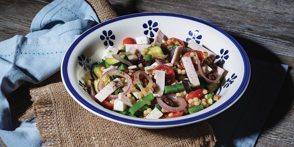 Fregola fredda con zucchine, prosciutto cotto e pomodorini