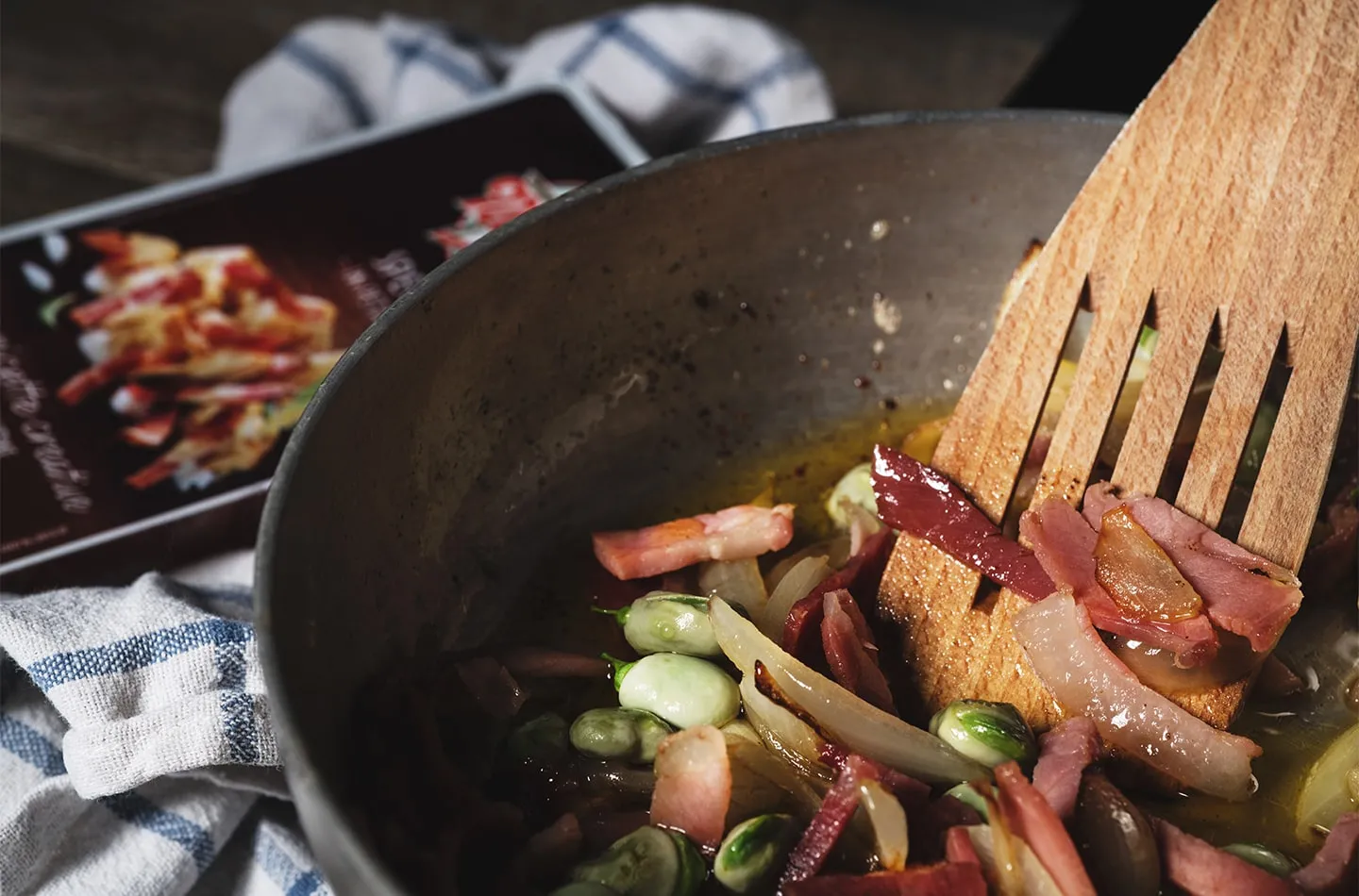 In un’ampia padella, soffriggete un trito di cipollotto in olio extravergine di oliva, poi aggiungete una confezione di Petali di Speck Negroni e mescolate tutti gli ingredienti. Ad essi unite anche le fave, il pepe e regolate di sale.