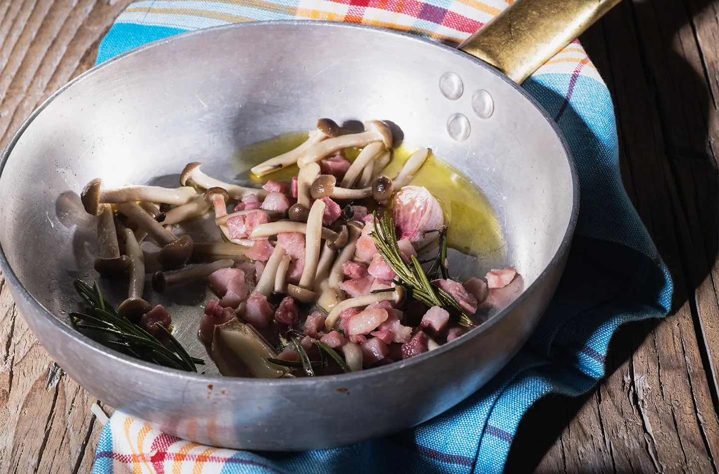 Rosolate in padella lo spicchio d’aglio in un filo d’olio, aggiungete la Pancetta affumicata Negroni e i funghi pioppini ben puliti. Aromatizzate con il rametto di rosmarino.
