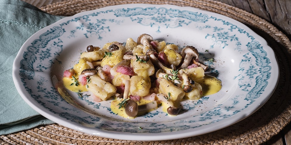 Gnocchi alla carbonara di pioppini e pancetta