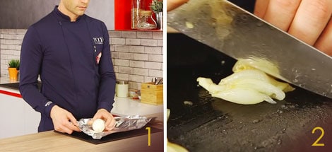 Per cuocere la cipolla ed esaltarne la dolcezza, avvolgetela nella carta stagnola (1) e fatela cuocere in forno caldo a 210° per 30 minuti. Quindi eliminate la parte esterna che si sarà abbrustolita e tagliate in fettine solo il cuore della cipolla (2)