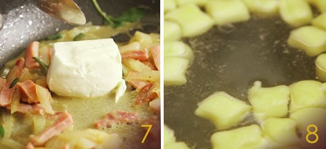A questo punto potete versare nella padella anche lo stracchino (7) che si scioglierà formando una cremina deliziosa. Buttate gli gnocchi nell'acqua bollente (8) e fate cuocere per pochi minuti - non appena saliranno a galla saranno pronti.