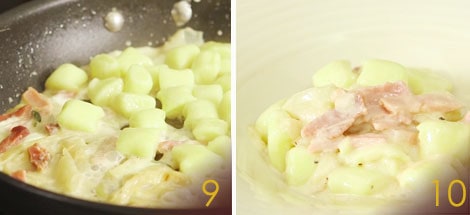 Scolate gli gnocchi con una schiumarola e metteteli a mantecare in padella con lo speck in petali e la crema di stracchino (9). In pochi minuti la crema si addenserà alla perfezione e potrete impiattare gli gnocchi (10) che andranno serviti e gustati ben caldi.