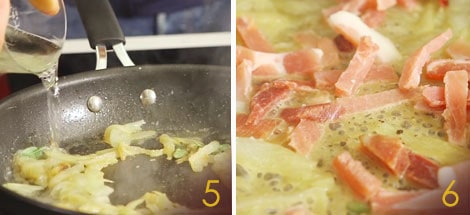 Fate sfumare con il vino bianco (5) ed aggiungete il sale e il pepe macinato fresco. Prima che il vino evapori del tutto potete aggiungere anche i petali di speck (6) e lasciar cuocere tutto insieme.