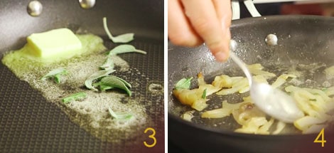 In una padella fate sciogliere il burro (3) per poi aggiungere le foglie di salvia. Mescolate con un rametto di rosmarino che lascerà un profumo intenso. Aggiungete la cipolla e fatela rosolare (4) per qualche minuto. Nel frattempo mettete a bollire l'acqua per gli gnocchi.