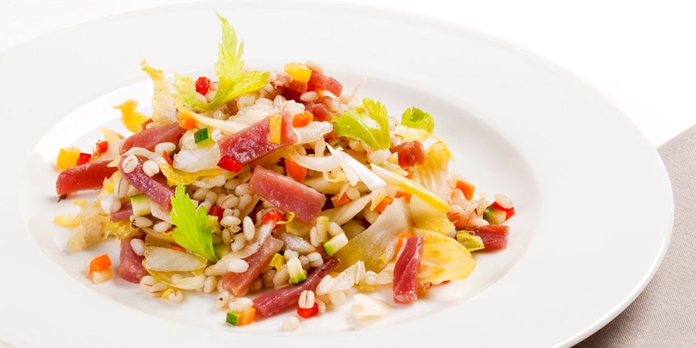 Lo chef ha realizzato tantissime ricette sfiziose con i salumi in petali Negroni e ora ci delizia con questa insalata di orzo condita con una crudaiola di verdure, insalata belga e prosciutto crudo in petali. La comodità dei salumi già tagliati in petali vi permetterà di inserire il prosciutto cotto, il petto di tacchino nelle vostre ricette estive. I salumi così oltre ad essere protagonisti di tanti panini farciti diventano perfetti per tante ricette da portare in tavola, dagli antipasti ai secondi.