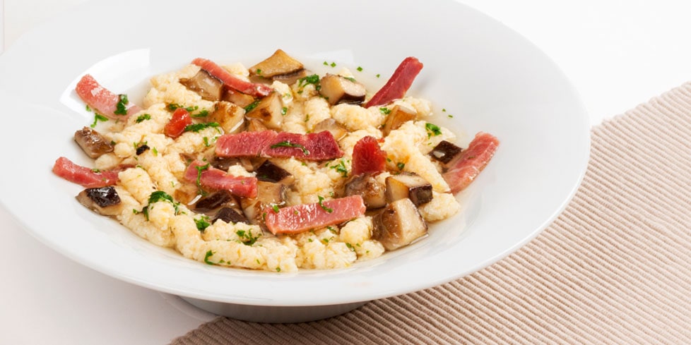 Far cuocere per due minuti circa e nel frattempo scaldare il brodo, scolare i passatelli nel piatto e coprire con il brodo di funghi e Petali di Speck.