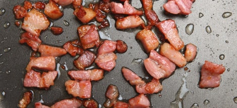 • Aggiungete nella padella la pancetta e lasciatela rosolare insieme alla cipolla per circa 5 minuti.