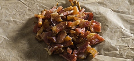 - In un’altra padella fate rosolare i Petali di guanciale Negroni, senza aggiungere olio o altri condimenti. Una volta pronto, lasciatelo raffreddare.