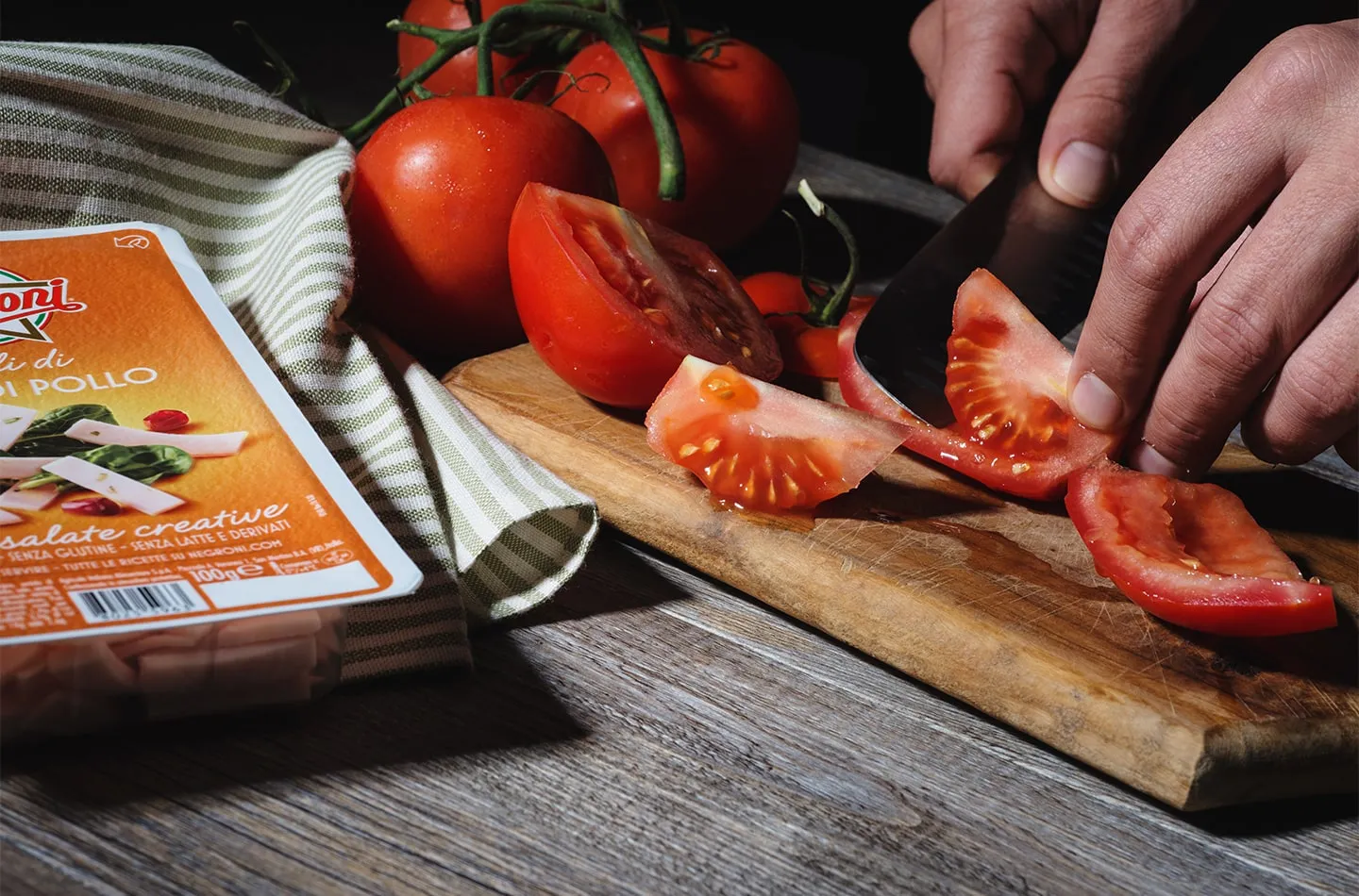 Dividete a metà i pomodori ramati maturi, eliminate i semi e tagliate la polpa a cubetti. Inserite in una terrina i pomodori, aggiungete sale, pepe, olio extravergine d’oliva, basilico e menta. Unite agli ingredienti del condimento i petali di Petto di pollo Negroni.