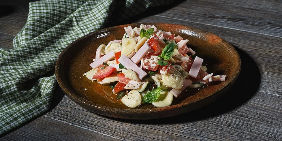 Nel frattempo lessate le orecchiette in abbondante acqua bollente salata, scolatele al dente e unitele al condimento di pomodori, basilico, menta e petali di Petto di pollo Negroni. Guarnite il vostro piatto con una spolverata di ricotta salata grattugiata e servite.