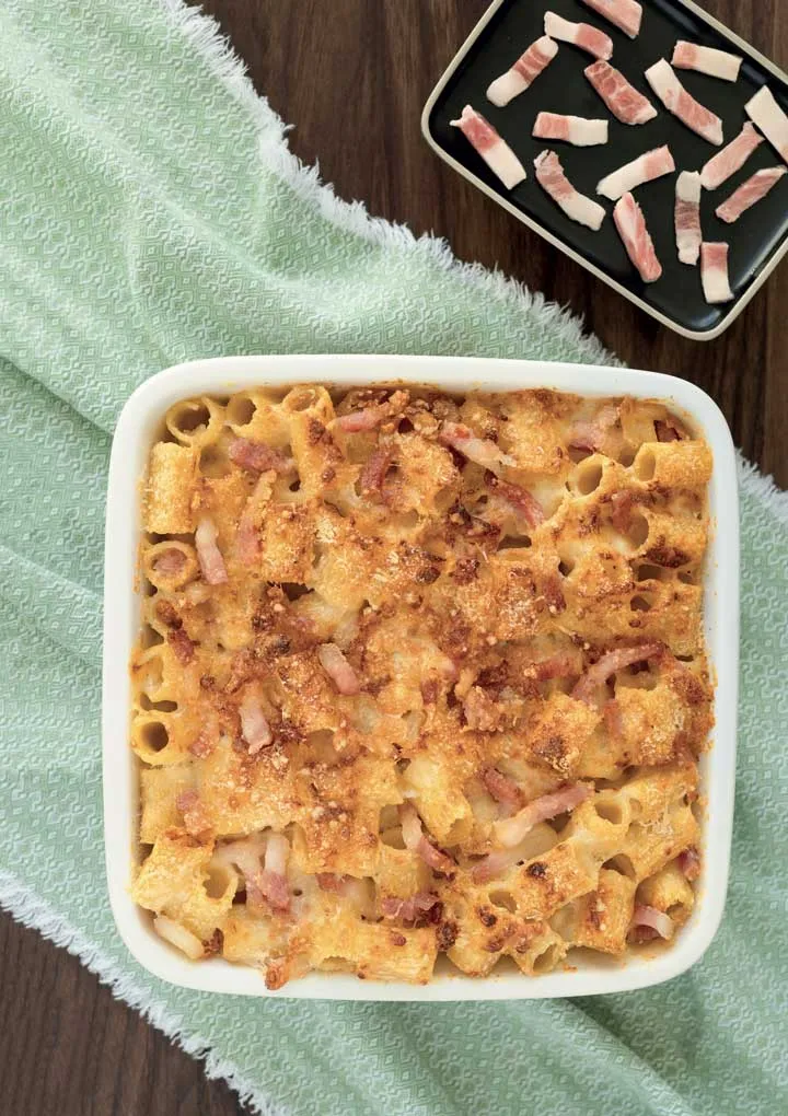 Pasta gratinata con stick di guanciale Negroni e mozzarella