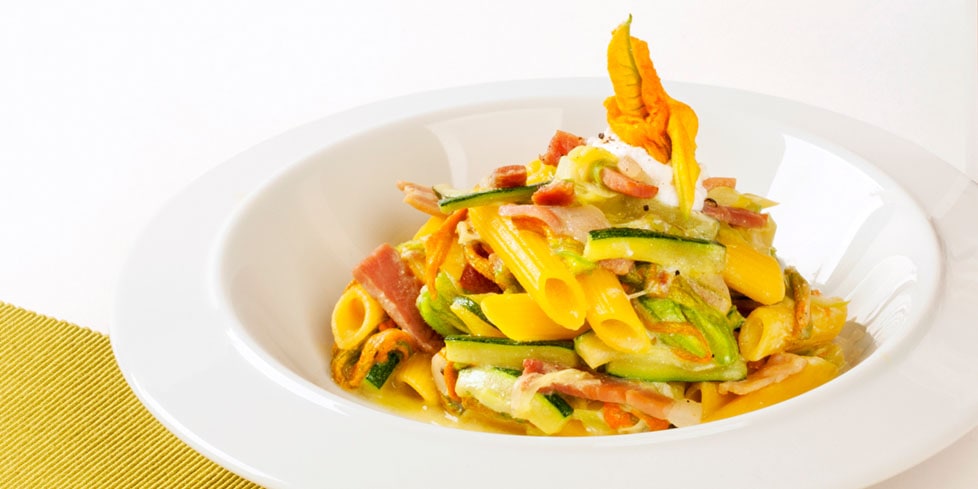 Un primo piatto fresco e veloce, perfetto per il menù di maggio: le pennette di mais condite con fiori di zucca e speck.