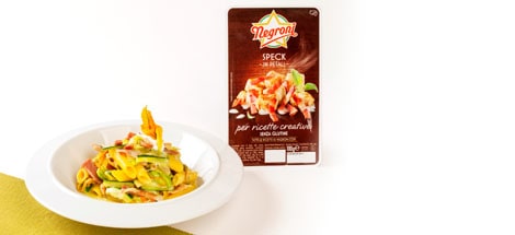 La pasta al mais, ideale per i celiaci, è ottima anche per chi non ha intolleranze o allergie. La cottura è più al dente della pasta tradizionale e si sposa benissimo con dei sapori forti come lo speck in petali Negroni e i fiori di zucca. La ricetta, creata da Simone Rugiati con i nuovi salumi in petali Negroni, è davvero veloce e molto facile da rifare a casa.
