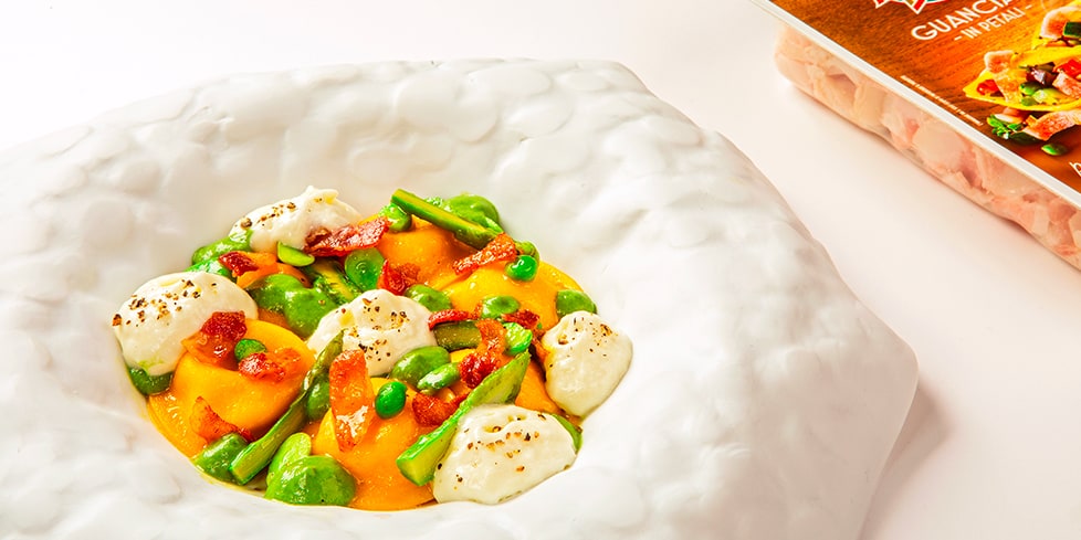 Immancabili le uova, il Pecorino e ovviamente i Petali di guanciale Negroni, a questi ingredienti vanno ad aggiungersi anche i piselli e le fave: il mix è esplosivo, i colori del piatto originali, il gusto irresistibile.
