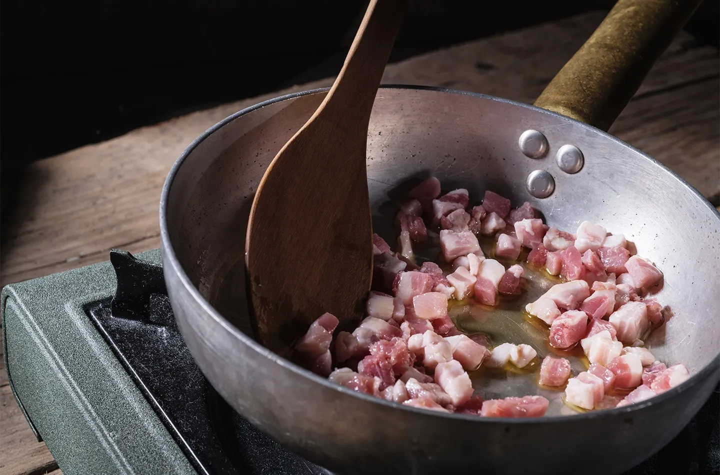 Lessate i rigatoni in abbondante acqua bollente salata. Nel frattempo, mettete i tuorli in una terrina e sbatteteli insieme alpecorino e ad abbondante pepe. Rosolate la Pancetta affumicata Negroni in una padella antiaderente con un filo di olio extravergine d'oliva. Aggiungete alle uova qualche cucchiaio di acqua di cottura della pasta e stemperate mescolando.