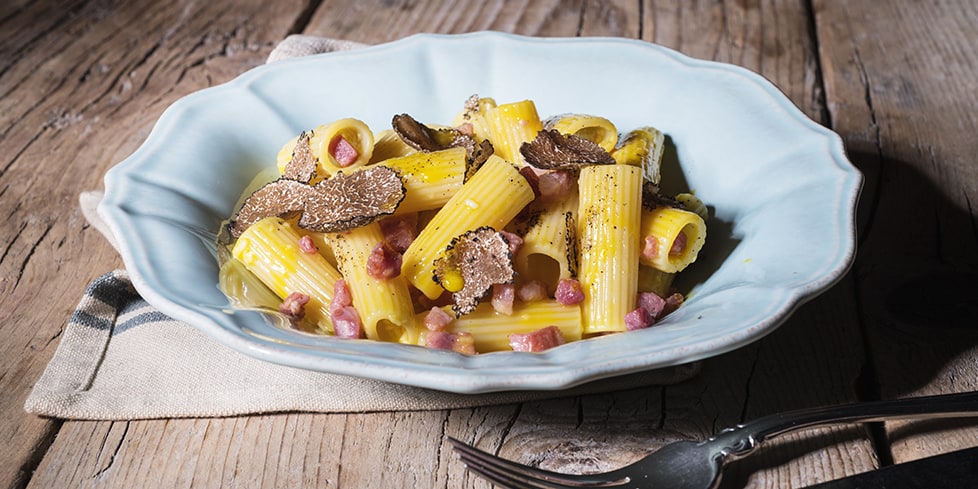 Rigatoni alla carbonara con tartufo nero