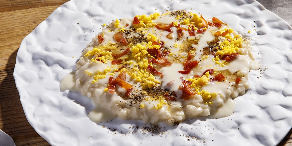Un risotto gourmet alla carbonara firmato Simone Rugiati