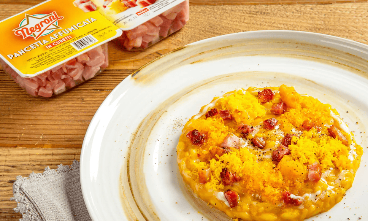 Ecco alcune varianti interessanti del risotto alla gricia che potresti provare, utilizzando diversi tipi di salumi per aggiungere nuove sfumature di sapore. Si comincia con il risotto alla gricia con pancetta affumicata: sostituisci il guanciale con i Cubetti di pancetta affumicata Negroni. La pancetta aggiungerà un tocco di affumicato che si combina benissimo con il pecorino e il pepe, creando un risotto dal sapore leggermente più intenso.