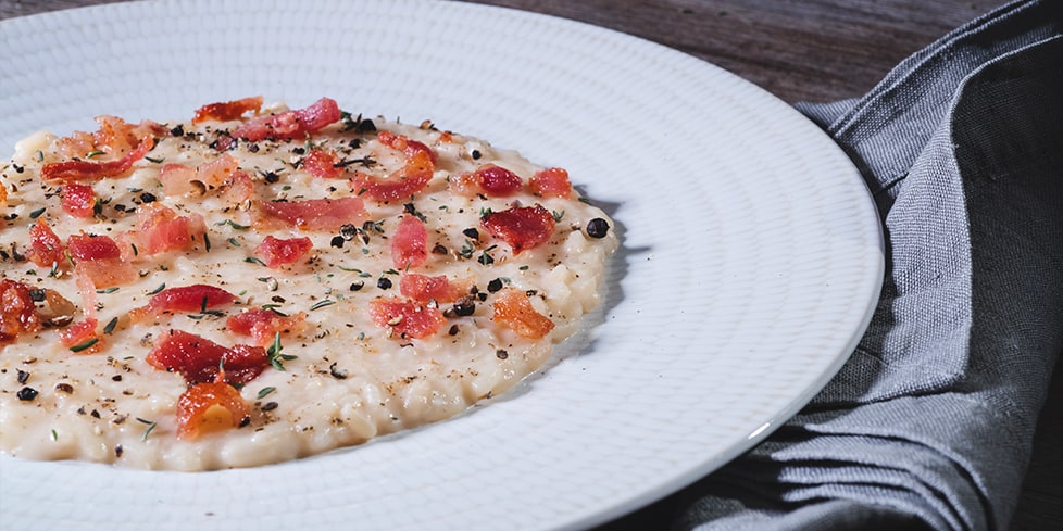 Il riso Carnaroli incontra il sapore deciso del pecorino e la croccantezza degli Stick di guanciale Negroni, per dare vita a un piatto ideale per un pranzo della domenica, o per una cena romantica. Il risotto alla gricia è semplice da preparare e con pochissimi ingredienti porterete in tavola un piatto da veri chef.