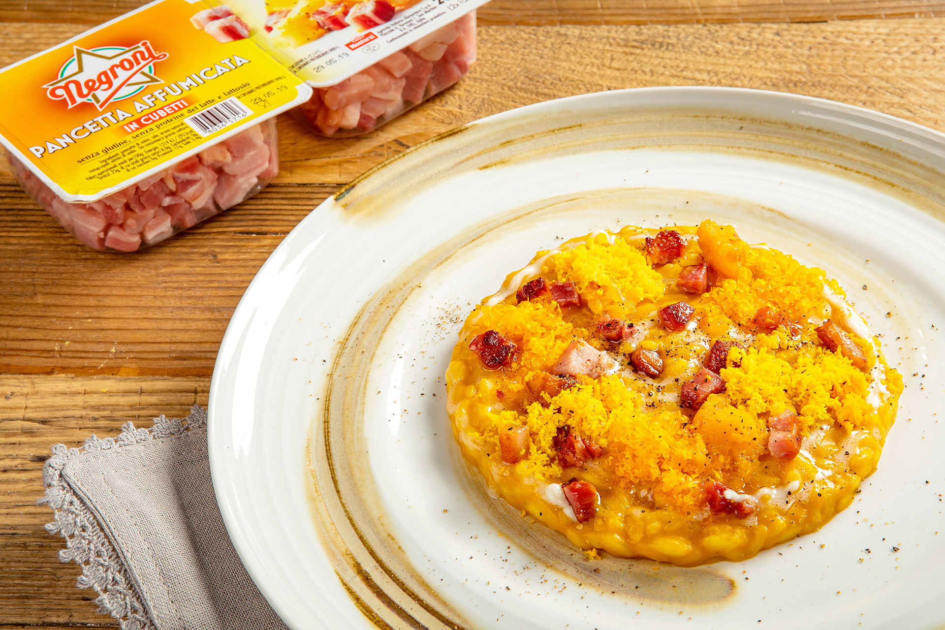 Preparate un risotto come da ricetta, a metà cottura iniziate ad aggiungere la crema di zucca fino ad ultimarne la cottura. Mantecate con il burro e mezzo pugno di pecorino grattugiato finemente. Servite formando una spirale con la fonduta di pecorino, aggiungete la Cubetti di Pancetta affumicata Negroni, qualche fiocchetto di polpa di zucca, la mimosa d’uovo e il tuorlo marinato.
