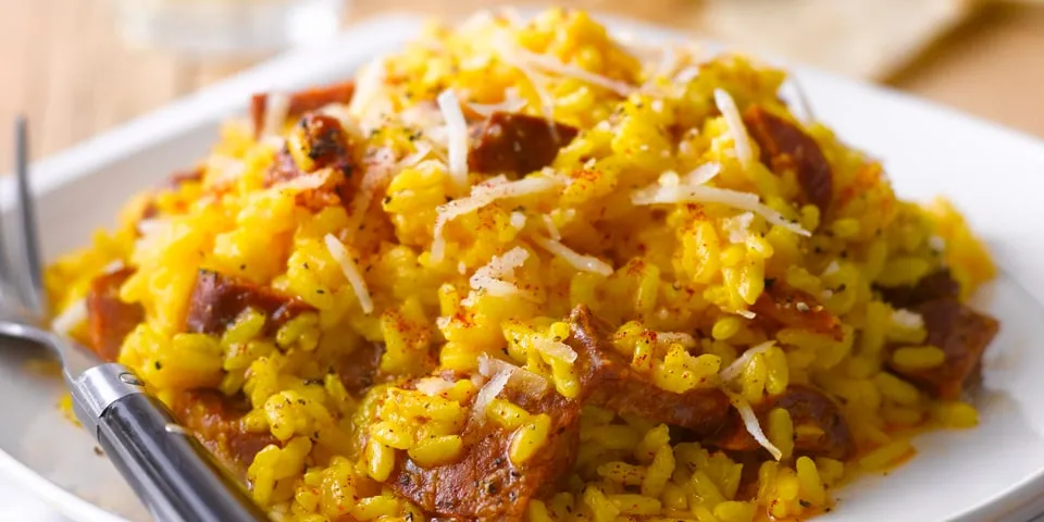 Il risotto allo zafferano si unisce al sapore unico del salame. Il risultato? Tutto da gustare!