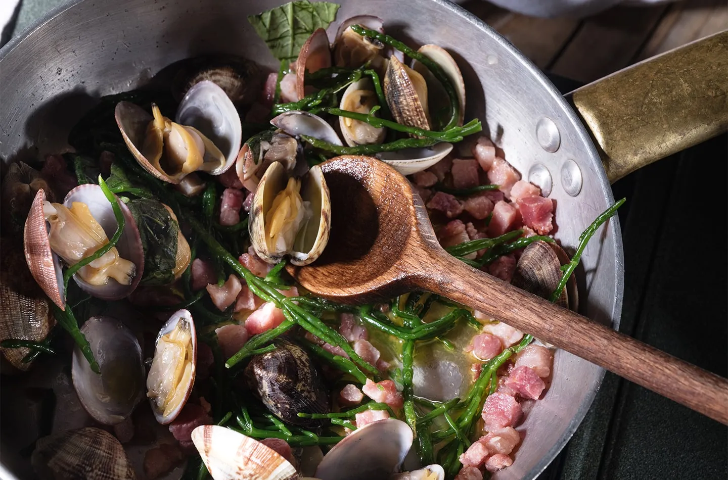 Accendete nuovamente il fuoco con gli asparagi di mare, unite le vongole e il loro succo di cottura filtrato, mescolate e dopo 2-3 minuti spegnete il fuoco.