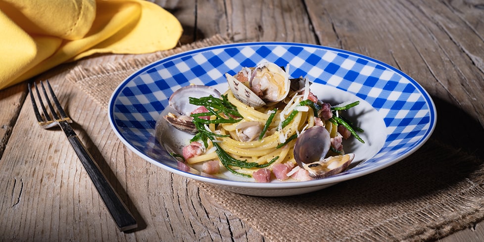 La vivacità della Pancetta affumicata Negroni incontra gli asparagi di mare e le vongole, a unire con armonia gli ingredienti ci pensano invece l'uovo e il pecorino romano. Sorprendete la vostra famiglia durante un pranzo della domenica. Lasciate a bocca aperta, ma non a bocca asciutta, il vostro partner durante una cena romantica e conquistatelo!
