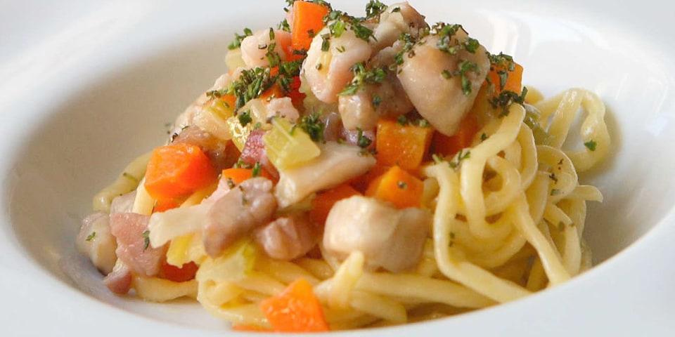 Spaghetti alla chitarra al ragù di coniglio con pancetta dolce