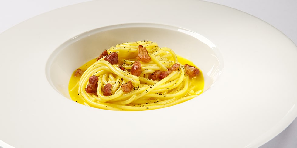 Spaghettone con crema di riso, zafferano e Cubetti di pancetta