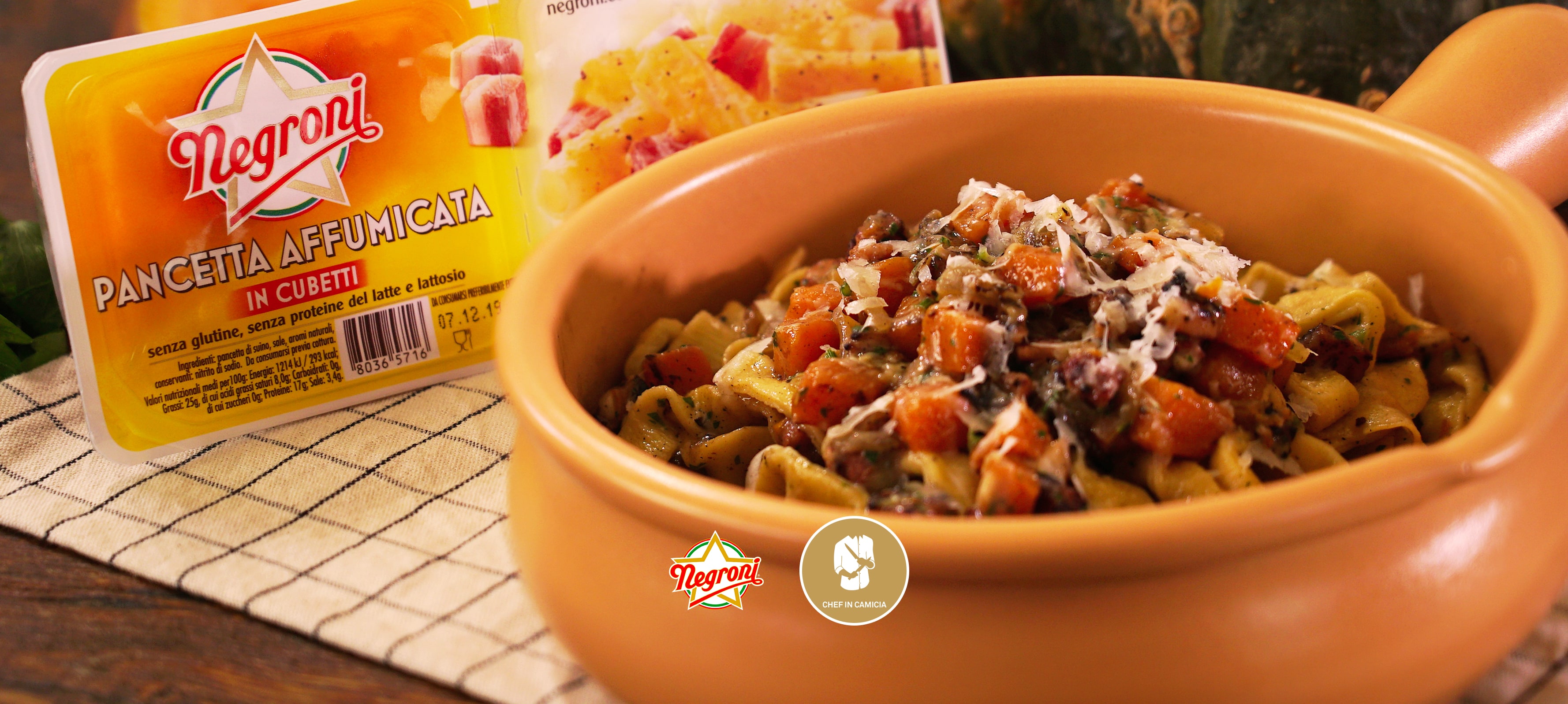 Chef in Camicia entra nella cucina di Negroni per proporre un primo piatto autunnale tutto da gustare per assaporare sapori autentici: le tagliatelle fresche con Cubetti di pancetta affumicata Negroni. La dolcezza della zucca incontra la vivacità dei Cubetti di pancetta affumicata Negroni per dare vita a un’esplosione di gusto.
