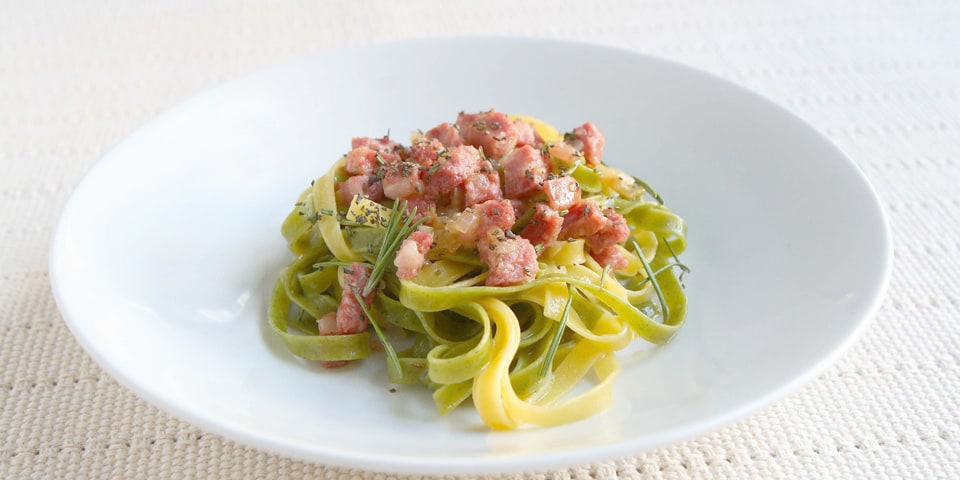 Tagliatelle paglia fieno con salsiccia affumicata e rosmarino