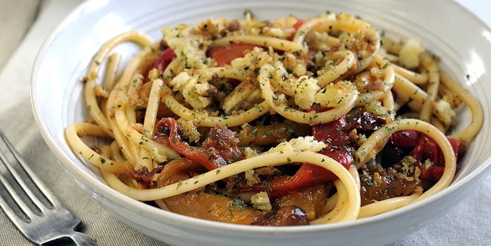 Quindi aggiungete i peperoni parzialmente lessati e mescolate tutti gli ingredienti. Quindi versate un cucchiaio di concentrato di pomodoro e un cucchiaio di acqua. Fate cuocere a fiamma media e appena il pomodoro comincerà ad asciugarsi, spegnete la fiamma. Nel frattempo mettete l'acqua sul fuoco e appena comincia a bollire buttate la pasta.  Quando i tonnarelli si saranno cotti, scolateli e versateli nella padella con i peperoni e il guanciale. Fate mantecare bene, se necessario aggiungendo un filo di olio. Spolverate del pan grattato e del pepe macinato fresco. Finite con del timo e portate in tavola ben caldo.