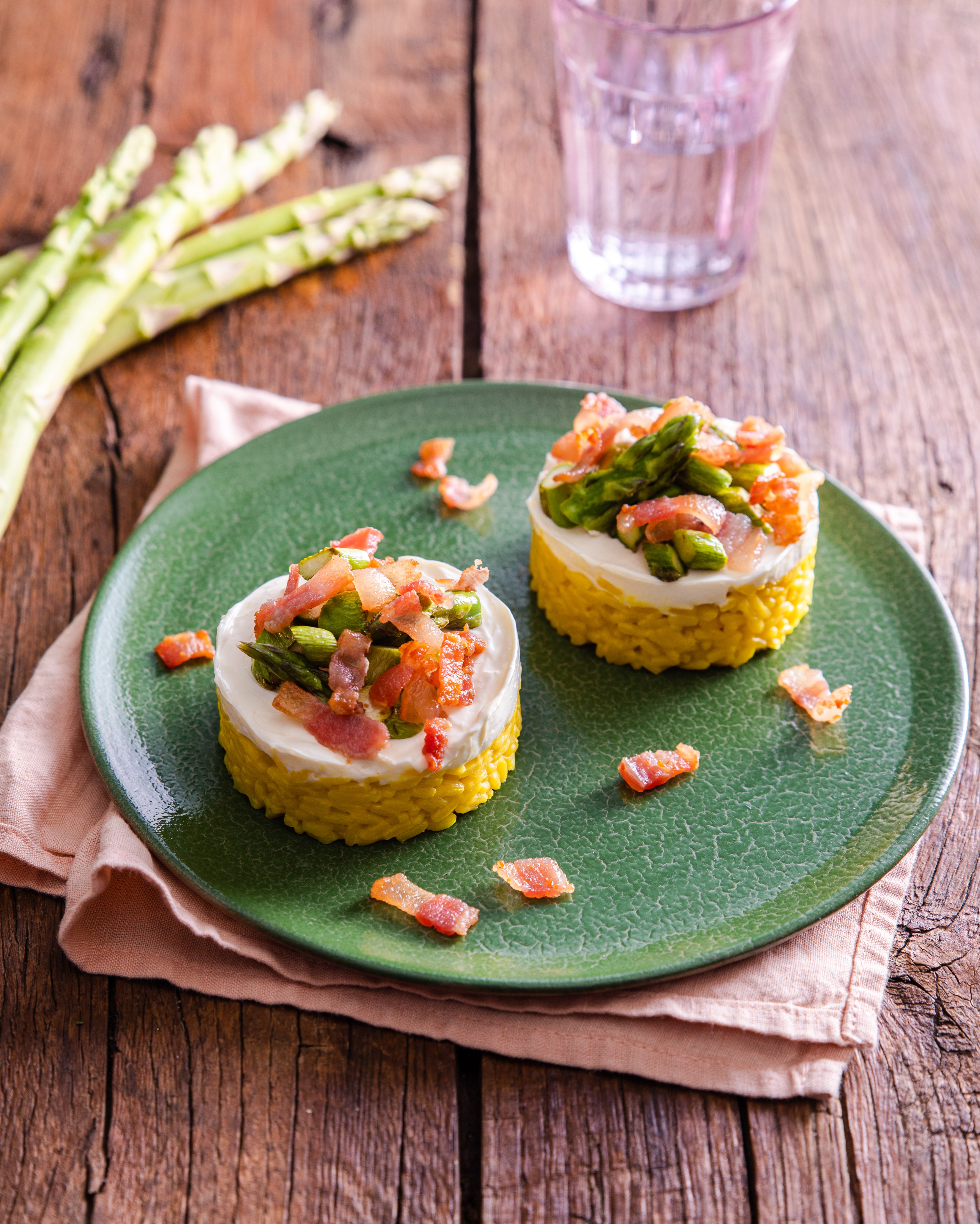 Rosolate i Petali di Guanciale Negroni in una padella antiaderente a fuoco vivace fino a quando non saranno croccanti. Mettete i Petali di Guanciale Negroni su un foglio di carta per fritti o su carta assorbente da cucina, in questo modo diventeranno ancora più crispy. Sfibrate i gambi degli asparagi con un pelapatate e sbollentateli in acqua bollente leggermente salata per 5 minuti. Scolate gli asparagi e saltateli nella padella in cui avete rosolato i Petali di Guanciale Negroni. Regolate di sale e di pepe gli asparagi e fateli cuocere per qualche minuto, dovranno essere cotti ma croccanti. Con l’aiuto di un coppapasta create una base di riso, spalmate uno strato di formaggio, aggiungete gli asparagi e il guanciale croccante. Decorate a piacere con una macinata di pepe.