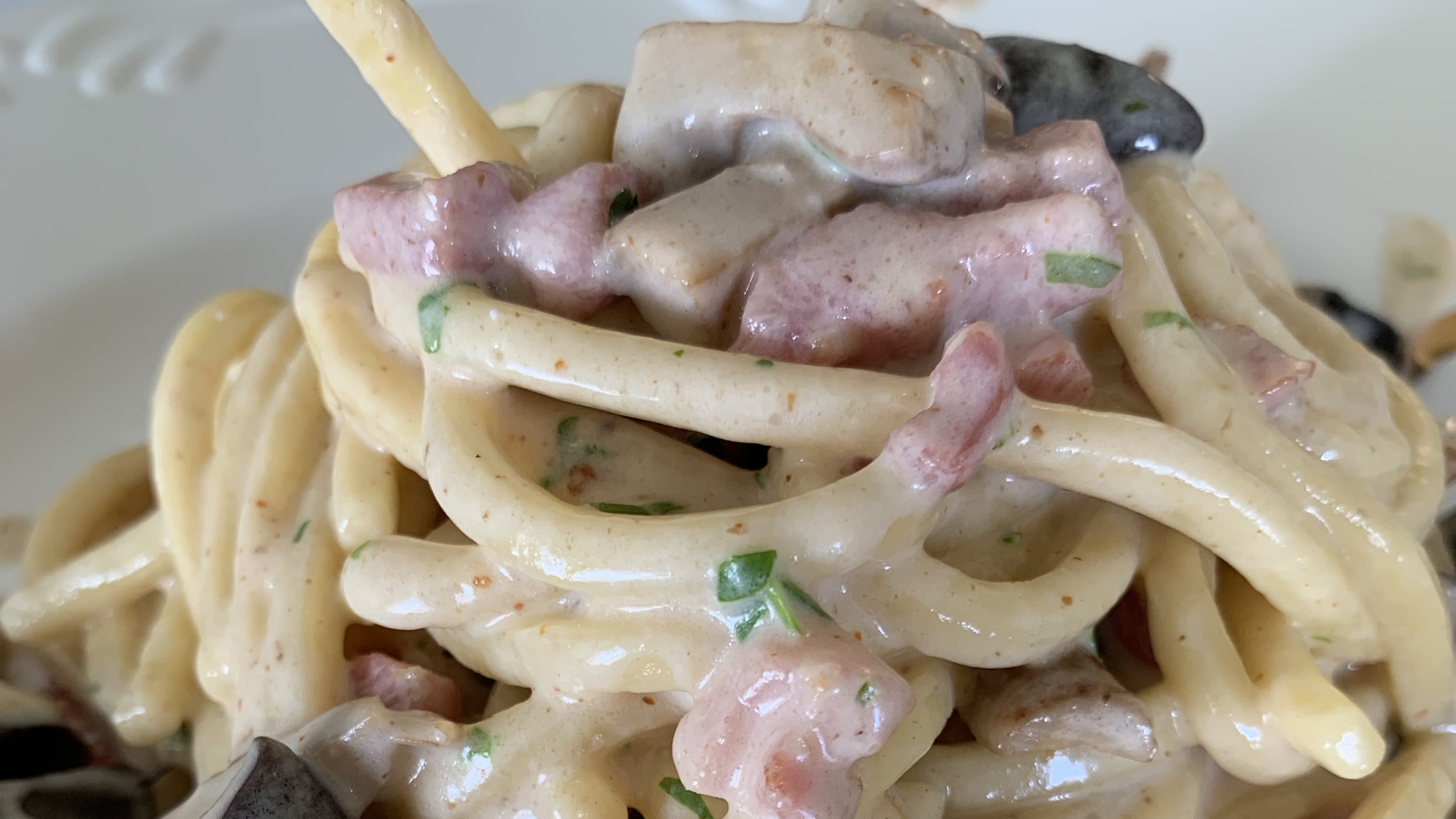 Troccoli panna, funghi e Cubetti di Pancetta Dolce Negroni