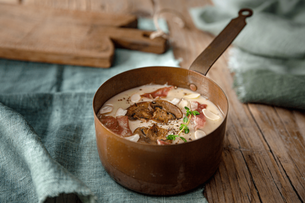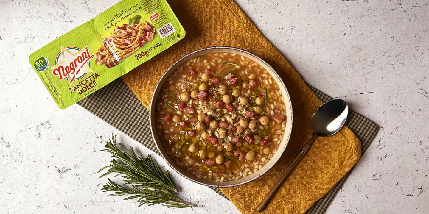 Per una versione più intensa e per gli amanti dei sapori decisi, sostituite i Cubetti di Pancetta con i Petali di Speck Negroni, perfetti da abbinare ai ceci e ai legumi come il farro e l'orzo.