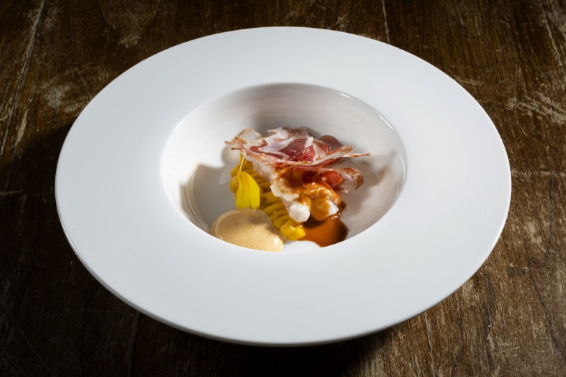 Scampo scottato, Pancetta di Zibello Negroni, salsa Choron e purea di carota al cardamomo