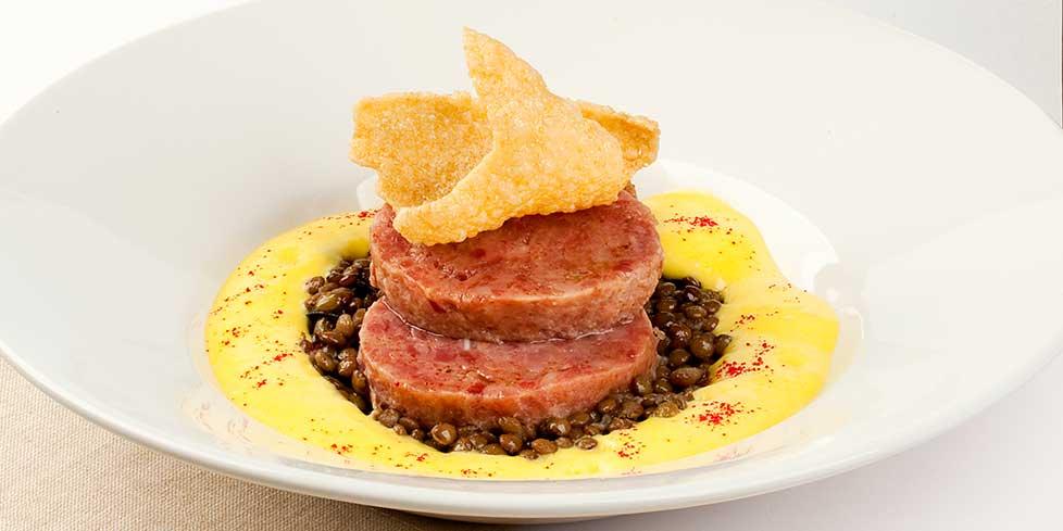 | Cotechino con vellutata di finocchi e crumble di lenticchie |