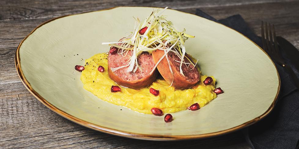 Cotechino con purè di patate al curry, melograno e porri croccanti