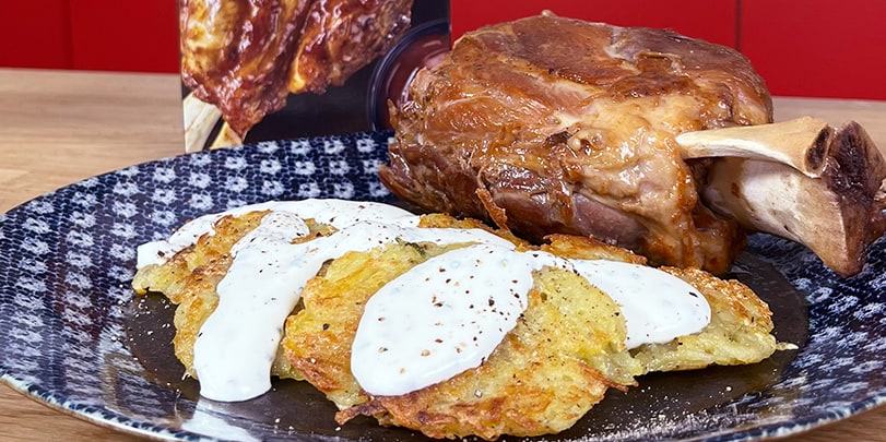 Mescolate bene, formate delle frittelline con le mani e friggetele in padella con un filo di olio fino a quando si sarà formata una crosticina dorata su entrambi i lati. Condite la panna acida con erba cipollina tritata finemente e pepe. Servite il Gran Stinco di Prosciutto Arrosto Negroni caldo con frittelle di patate e panna acida all’erba cipollina.
