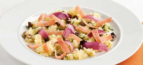 Un'insalata così è l'ideale anche per quelle serate da passare davanti alla tv, per smorzare gli attacchi di fame improvvisi che impediscono di avere voglia e pazienza di mettersi ai fornelli per più di due minuti. Questa insalata è uno dei tanti esempi di insalata mista in cui frutta fresca o secca abbinataai salumi e alle verdure diventaun'ottima altenativa ai panini, alla pasta o alla pizza: leggerezza con tanto sapore.