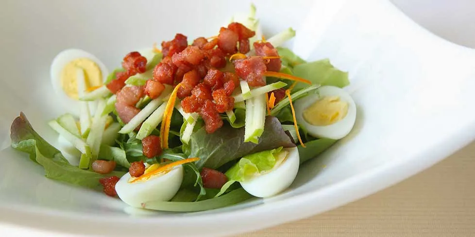 Un'insalata che vi stupirà con mela verde, pancetta dolce croccante, uova di quaglia sode e citronette agli agrumi. Un gusto da provare.