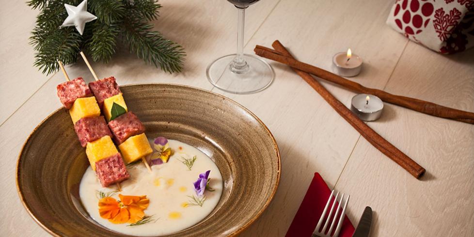 Ideali per il pranzo del primo dell'anno gli spiedini di cotechino e polenta fritta sono gustosi e molto scenografici. Cominciate preparando la polenta, anche usando quella a cottura veloce, Una volta pronta stendetela su un piano di ceramica ottenendo uno strado alto due centimetri. Lasciatela raffreddare bene e poi tagliatela in cubotti che farete saltare in padella con un po' di olio fin quando non si sarà formata una bella crosticina esterna. Nel frattempo fate cuocere il cotechino e quando sarà pronto tagliatelo in cubi della stessa dimensione della polenta. Componete gli spiedini che andranno serviti sulla vellutata di sedano rapa. Tutta la ricetta, cliccando sulla foto.