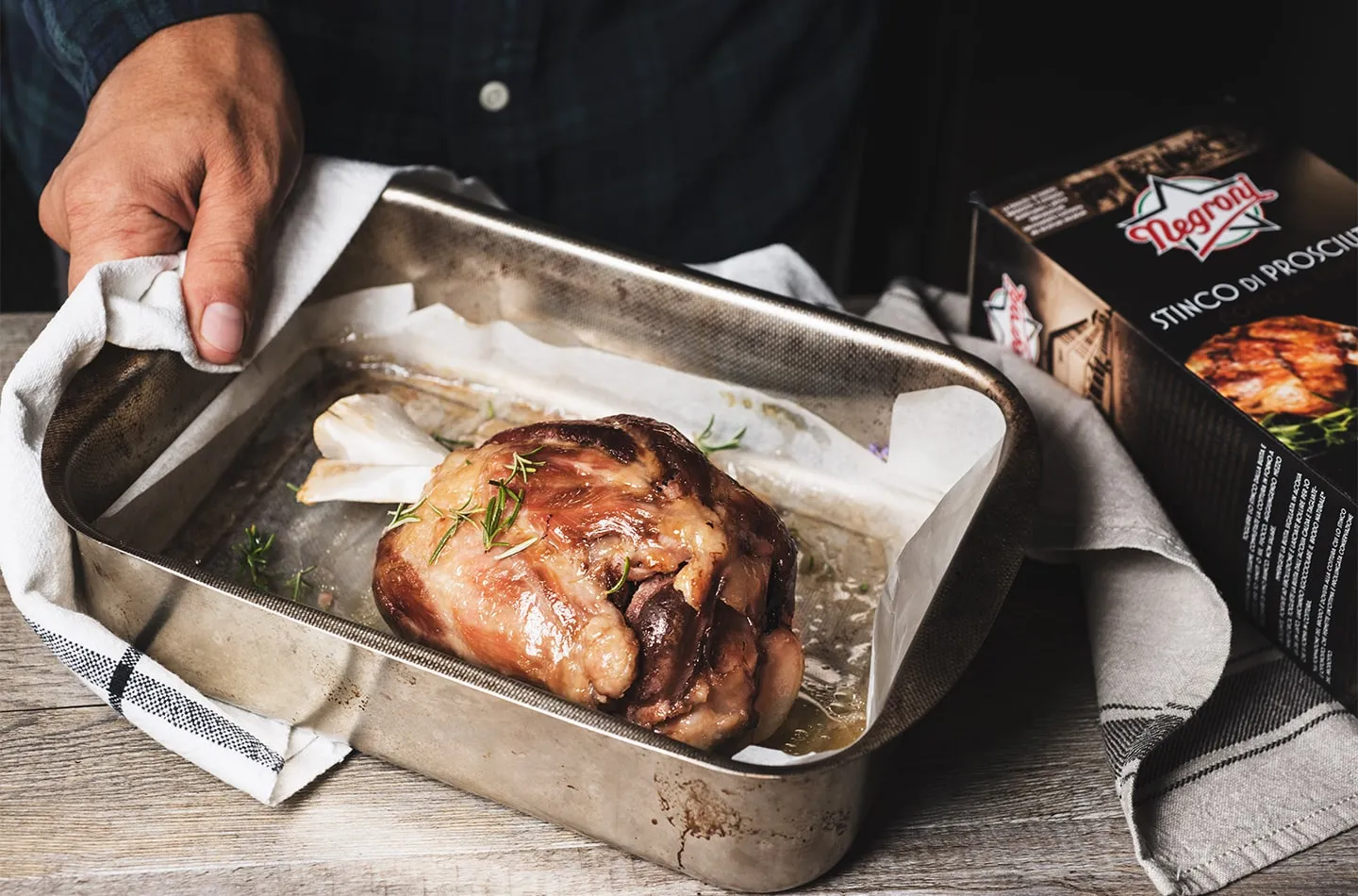 Cuocete lo Stinco di Prosciutto Negroni in forno seguendo le indicazioni sulla confezione, poi tagliatelo a fette.