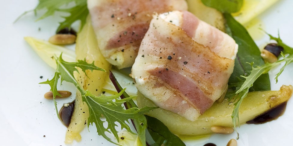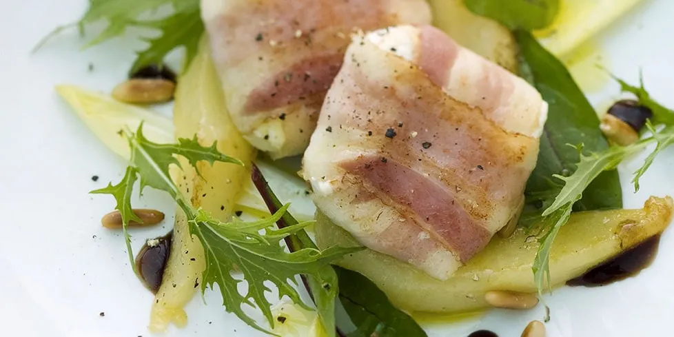 Tomini e pancetta con carpaccio di pere e rucola
