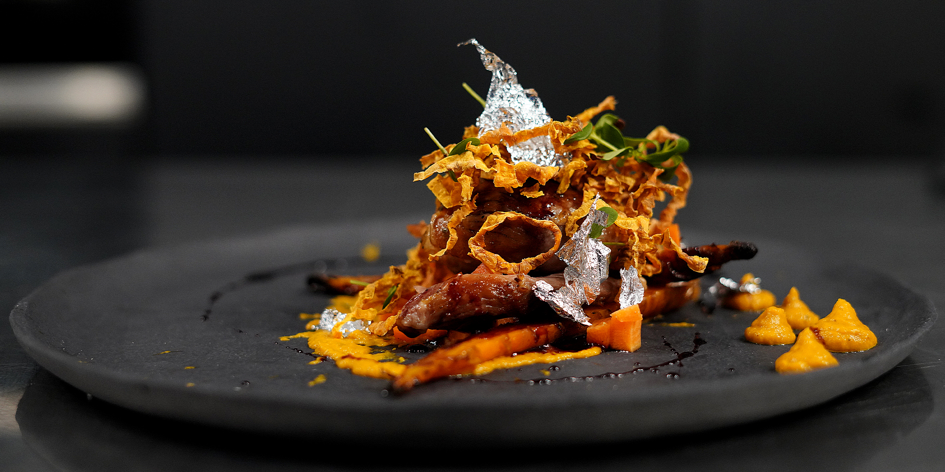 Nel piatto, versa due cucchiai di crema di carote, poi aggiungi la mezza carota, lo Stinco sfilacciato a mano, crudità di carota e per finire chips di carota.
