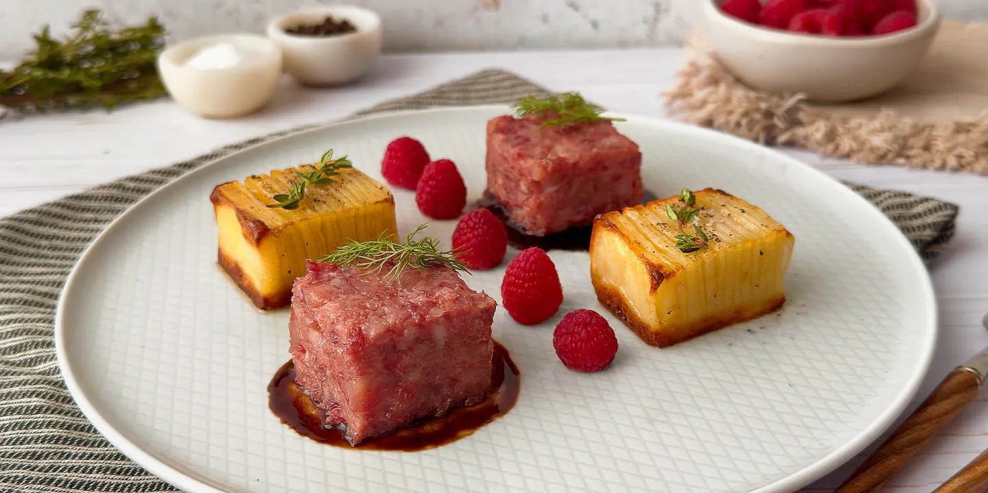 Destinazione Stoccolma, Cubi di Gran Cotechino con patate hasselback e guarnizione di lamponi